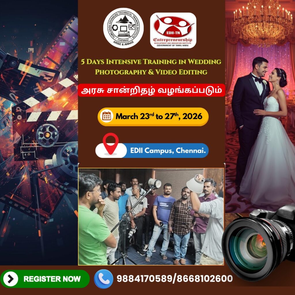 Tamilnadu Advanced Technical Training Institute (TATTI) in collaboration with EDII (Entrepreneurship Development and Innovation Institute) presents an exclusive 5-days hands-on training designed for aspiring photographers and videographers who want to specialize in weddings, portraits and commercial shoots.